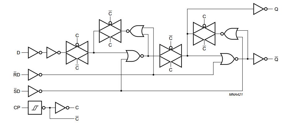 The 74HC74D is a high-speed Si-gate CMOS device and is pin compatible with low power Schottky TTL (LSTTL). The device is specified in compliance with JEDEC standard no. 7A. The 74HC74D is a dual positive-edge triggered, D-type flip-flop with individual data (D) inputs, clock (CP) inputs, set (SD) and reset (RD) inputs; also complementary Q andQ outputs. The set and reset are asynchronous active LOW inputs and operate independently of the clock input.