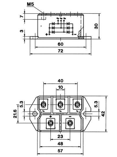 SKD6216 features: (1)Robust plastic case with screw terminals; (2)Large, isolated base plate; (3)Blocking voltage up to 1800 V; (4)High surge currents; (5)Three phase bridge rectifier; (6)Easy chassis mounting; (7)UL recognized, file no. E 63532.