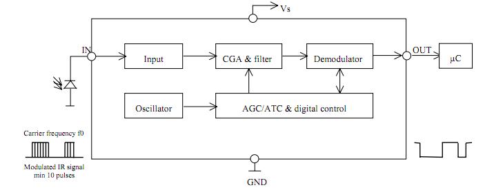 The irm3638n3 is a miniature type infrared remote control system receiver. The irm3638n3 has been developed and designed by utilizing the most updated ICtechnology. The PIN diode and preamplifier are assembled on lead frame, the epoxy package is designed as an IR filter. The demodulated output signal can directly be decoded by a microprocessor. The applications of the irm3638n3 include Optical switch, AV instruments such as Audio, TV, VCR, CD, MD, etc., Home appliances such as Air-conditioner, Fan, etc. The other equipments with wireless remote control. CATV set top boxes, Multi-media Equipment.